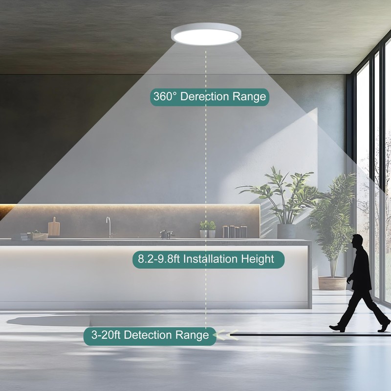 - 12 Inch Motion Sensor Ceiling Light – Built-in microwave sensor (360° detection,5-20 ft range) automatically turns on when motion is detected and shuts off after 30s/180s. No more fumbling for switches in the dark—perfect for hallways, stairs, closets, garages, and basements..(Note: This sensor light is hardwired, AC120V, not battery-powered)