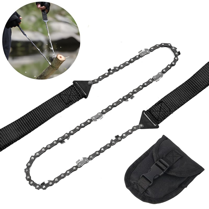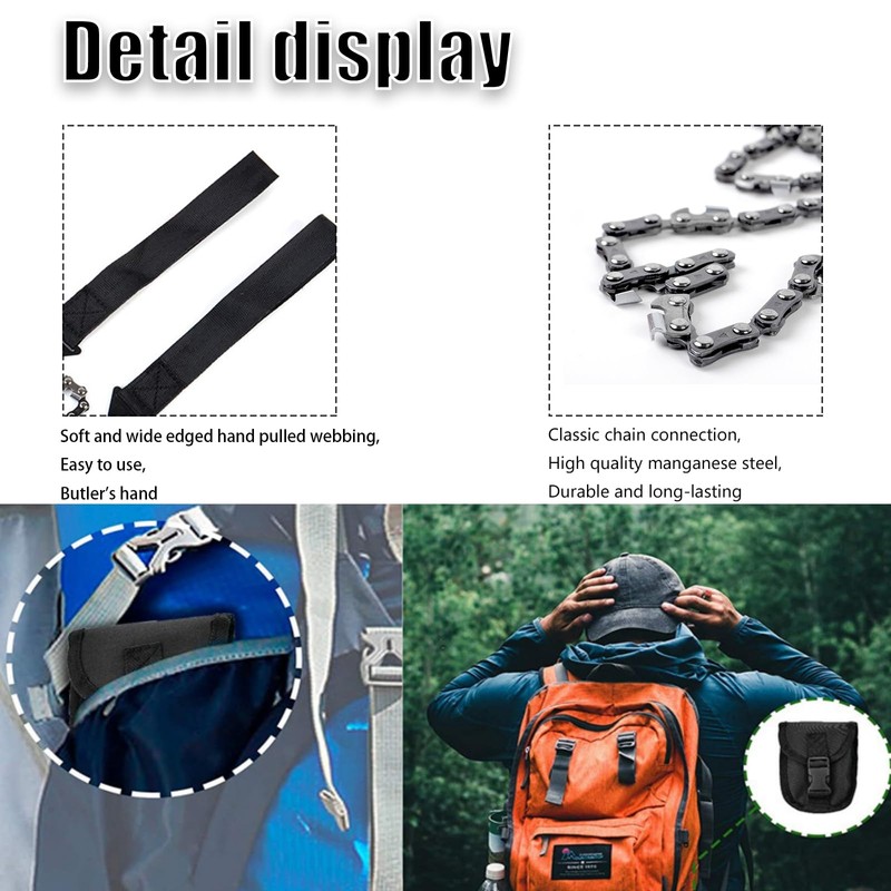 - Lightweight chain saw: Lightweight chain saw: Pocket chain saw has a folding design that can be placed in a pocket, the folding saw is suitable for backpacking, the saw is light weight and small size. This emergency survival kit chain saw line is easy to pack and carry in a nylon bag. It can also be a gift for Father's Day.
