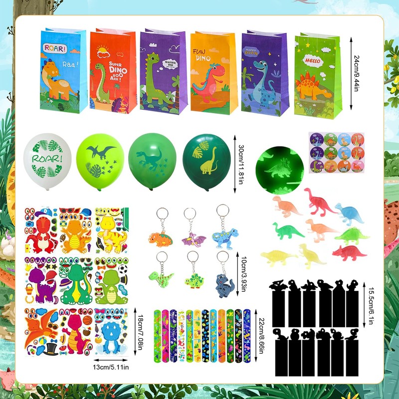 - Dinosaur children's birthday decoration: you will receive dinosaur party children's birthday bags, 12 x luminous dinosaur figures, 6 x dinosaur gift bags, 9 dinosaur stickers, 8 dinosaur balloons, 12 dinosaur bracelets, 12 dinosaur rings, 12 dinosaur scratch pictures, 12 bookmarks, 12 coloured ribbons. This children's birthday party bag set contains a variety of surprises that your child and his friends give indelible memories.