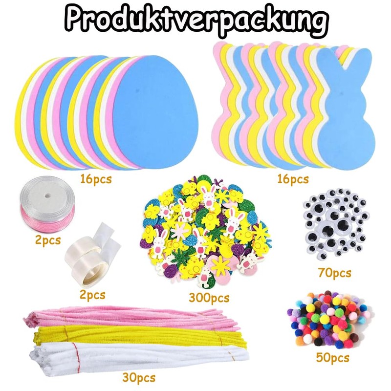 - Easter craft set for children: Easter craft contains 16 rabbits (four colours, 4 of each colour), 16 eggs (four colours, 4 of each colour), two rolls of ribbon (white + pink), two rolls of tape, 300 small stickers, 70 small eyes, 50 sponge balls.