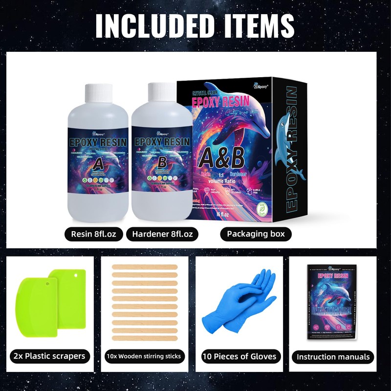 - [Perfect Epoxy Resin Kit]:Includes 8 oz resin, 8 oz hardener,10 x wooden stirring sticks, 10 x gloves, 2 x plastic spatulas. Everything you need to start your project is included, perfect for experienced people and beginners.