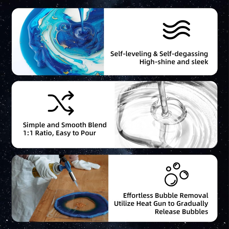 - [High Quality Resin Epoxy]:Crystal clear, easy to mix, less bubbles and self defoaming self-leveling function, safe and non-toxic, filler does not settle after mixing, easy to complete perfect works without worry.