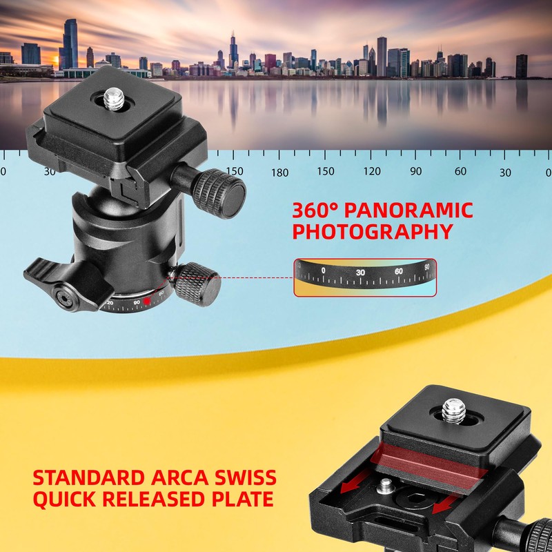 - 360° Panoramic Tripod Head - Smooth tripod mount enables professional panoramic shots. Dual-threaded base (3/8" with 1/4" adapter) fits tripods/monopods. 360° panoramic ball head precision controls every angle.