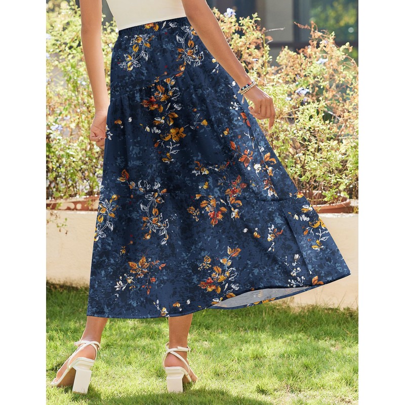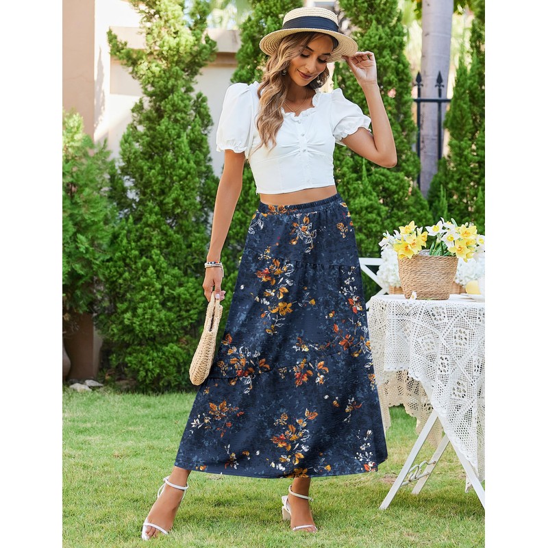 - 【Feature】: Maxi skirts for women comes with floral print/elastic high waist/a-line long skirts/flowy swing skirts/asymmetric tiered beach skirt with pockets/ankle length skirt/boho maxi skirt