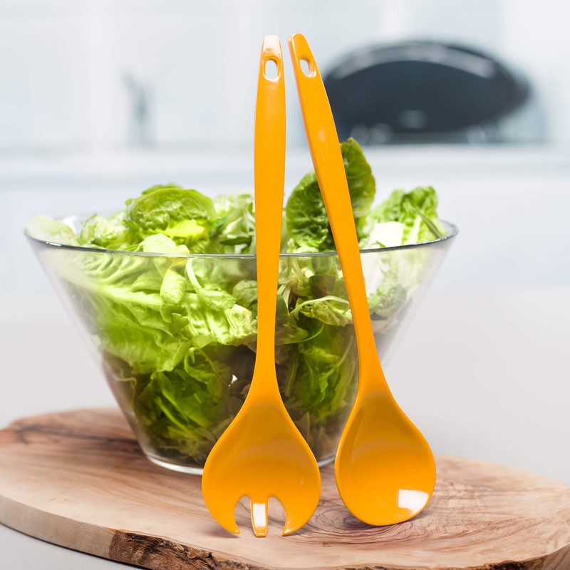 - Specially designed serving spoon and fork have extra-long handles for getting deep into salad bowls for tossing and mixing with ease;