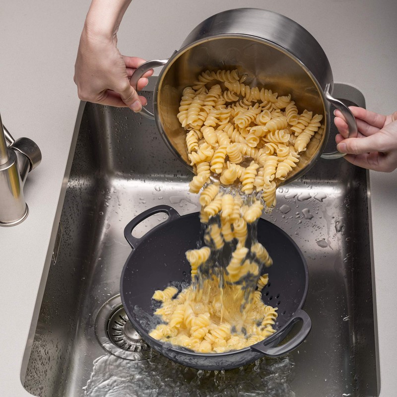 - Stands without support due to the circular foot on the base and there are holes in the base of the colander ensuring no liquid remains.