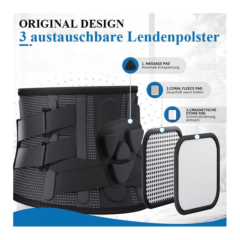 • Original design - 3 types of removable lumbar pads: Unlike similar products on the market, our back support belt for men and women comes with three removable spacers. Namely: a warm coral velvet pad, a pain-relieving magnetic pad and a massage pad. These spacers are close-fitting, allowing relaxation, relief and warmth to the back and provide targeted relief for back problems.