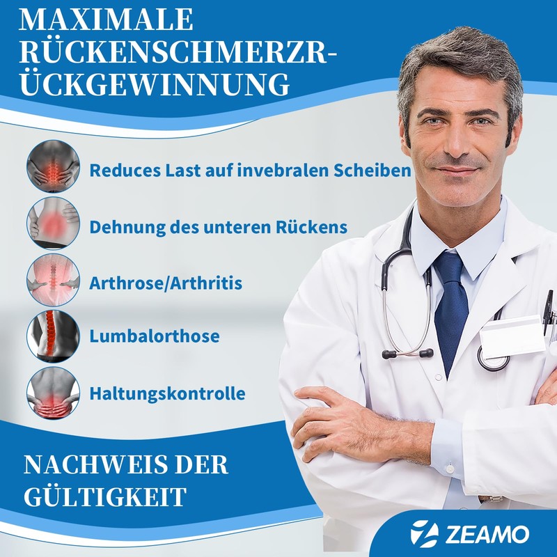 • Effective pain relief: After years of research and market studies, ZEAMO has developed this ergonomic back support belt that supports your lower back in 360 degrees and effectively relieves back pain caused by lumbago, scoliosis, herniated discs, sciatica and lumbar muscle tension.