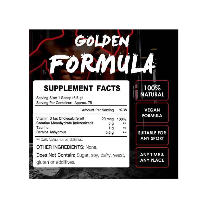 • High Potency Formula: Each serving provides 5 grams of 99.99% pure creatine monohydrate. Taurine+Betaine Anhydrous+Vitamin D+Creatine collaborate to help all cells in your body maximize their energy, and enjoyably and effortlessly achieve workout results!
