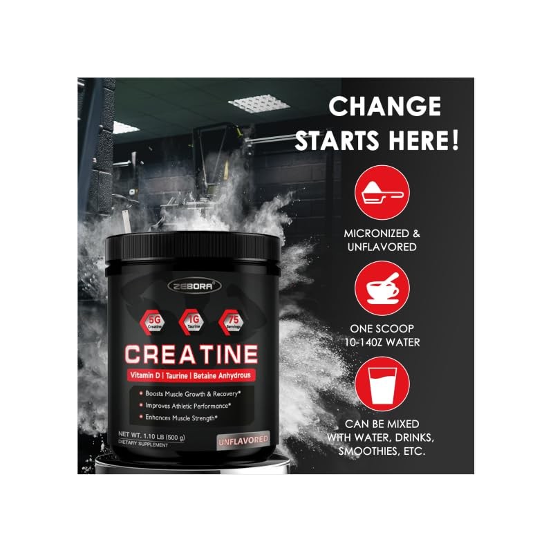 - Reach Peak Performance: ZEBORA creatine monohydrate powder helps the body replenish ATP and energy stores and increase muscle endurance, elevate your gains to new heights, and promote muscle repair.