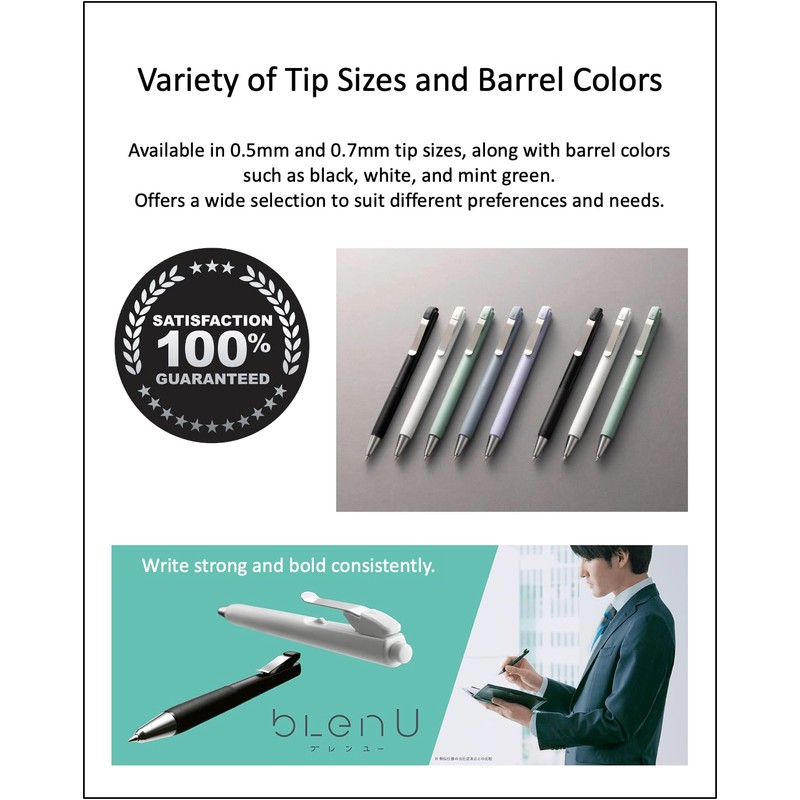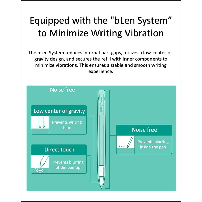 - Equipped with the "bLen System" to Minimize Writing Vibration: The bLen System reduces internal part gaps, utilizes a low-center-of-gravity design, and secures the refill with inner components to minimize vibrations. This ensures a stable and smooth writing experience.