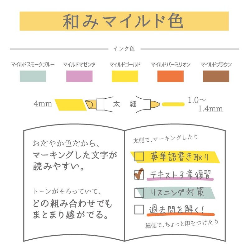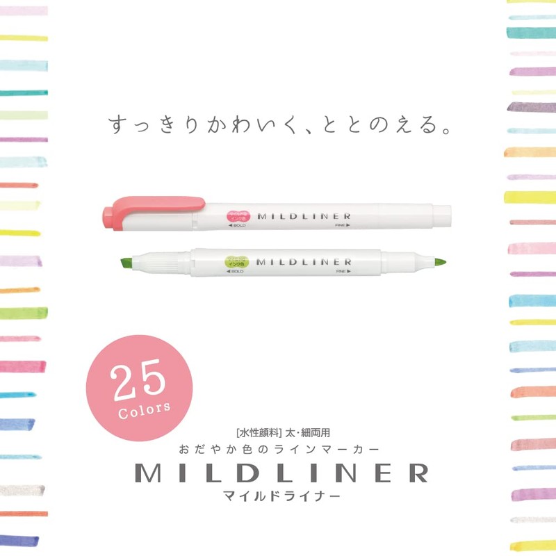 The Mildliner highlighter features a unique color that shows up softly on paper. It has just the right shade to attract your attention, but won't overwhelm you with bright fluorescence. The highlighter is double-sided with a broad and fine tip.This set contains 5 colors:Mild Brown, Mild Vermilion, Mild Gold, Mild Magenta, and Mild Smoke Blue.