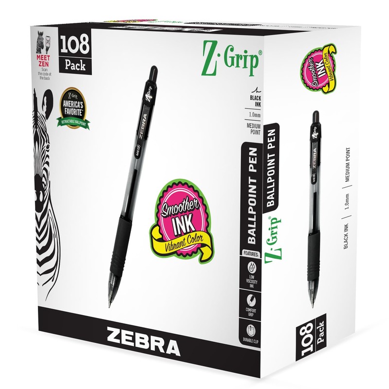 Zebra Pen Z-Grip Retractable Ballpoint Pens, Medium Point, 1.0mm, Black Ink, Soft Latex-Free Grip, Metal Pocket Clip, Plastic Barrel, 108 Pack, Ideal School Supplies & Office Supplies (22108)