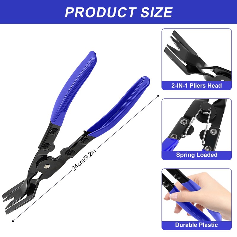 - 2 in1 Clip Pliers : The plier with 1-2mm thickness head, you can easily slide into confined areas of bumper clips, plastic rivets and fasterners, and clear away car door panel and upholstery clips easily.