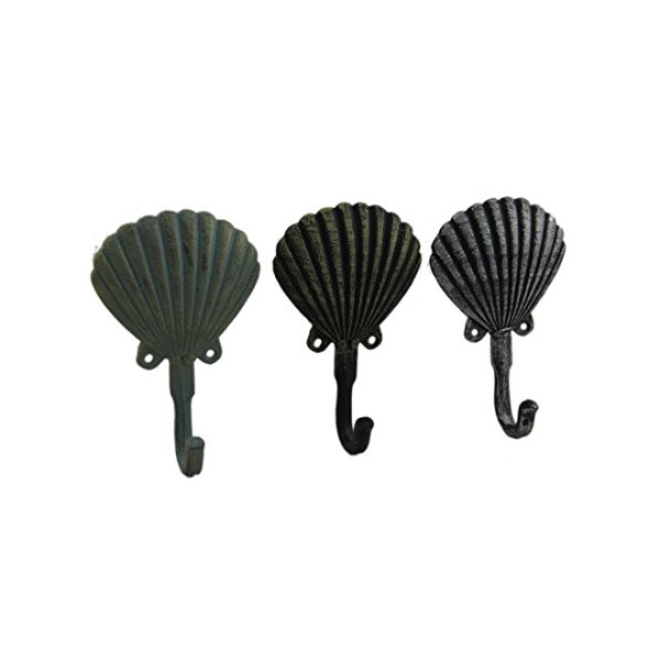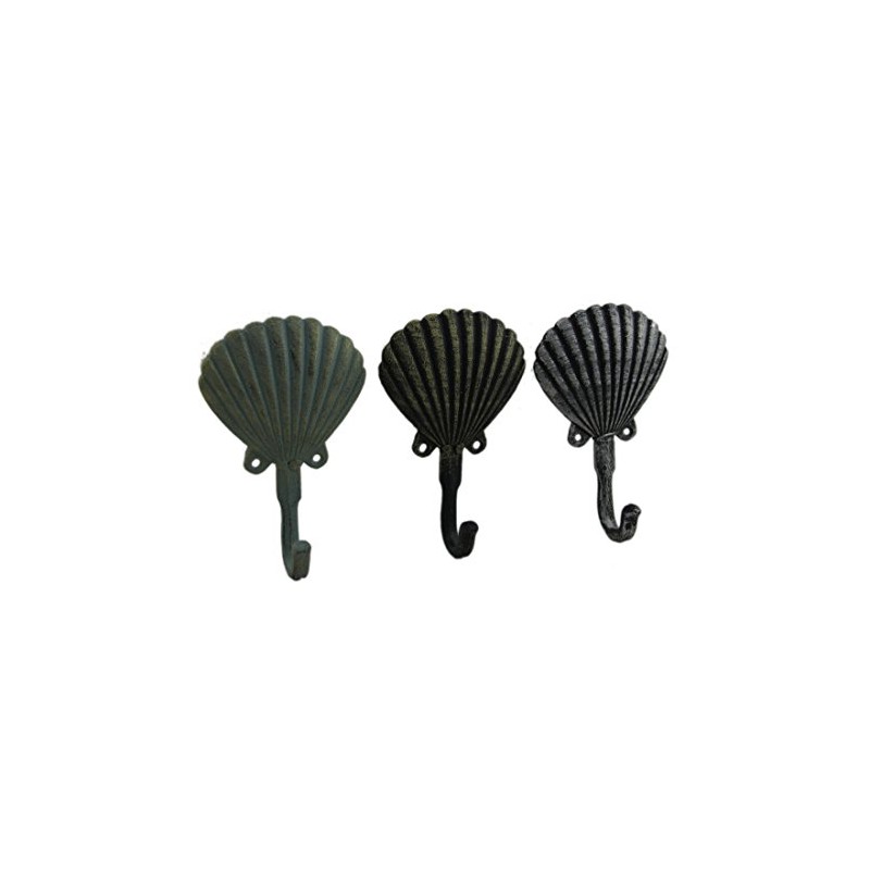 Zeckos Distressed Scallop Shell 3 Piece Coastal Cast Iron Wall Hook Set