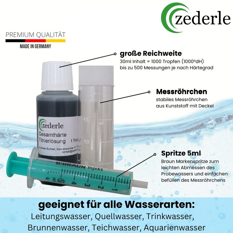 - [Very good price performance ratio:] The number of regulations: the zederle water hardness test with 30 ml is sufficient for approx. 1000 dH. With a water hardness of 2 °dH, approx. 500 tests. With a water hardness of 5 °dH, approx. 200 tests. With a water hardness of 10 °dH, this results in approx. 100 tests and with a water hardness of 25 °dH, approx. 40 tests. Suitable for all types of water, whether in the home or garden.