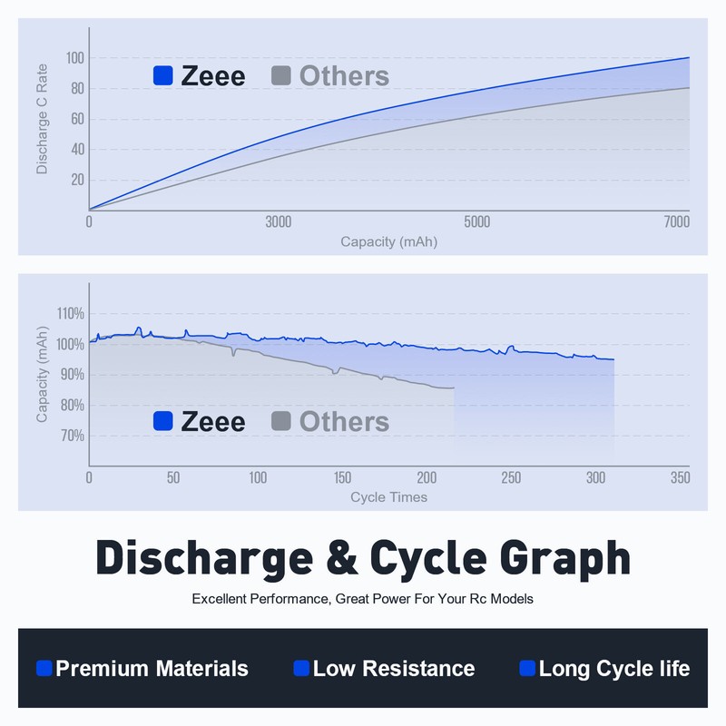 All of **Zeee RC LiPo Batteries** are designed with safe and steady formula of raw material, smooth and steady discharge curve and rigorous scientific quality control system, in order to ensure longevity and reliability. Our batteries are manufactured using the superior ‘stacking’ method, which provides you with reliable capacity and consistent power.