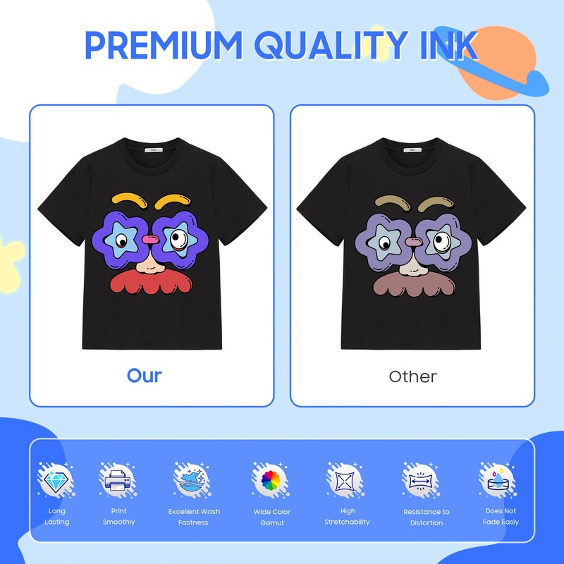 - This DTF ink guarantees clear, vivid patterns that remain vibrant even after multiple washes. It is perfect for creating custom apparel, personalized gifts, and home décor. With excellent ink stability, the prints stay sharp and durable, ensuring premium-quality results for all your creative ventures