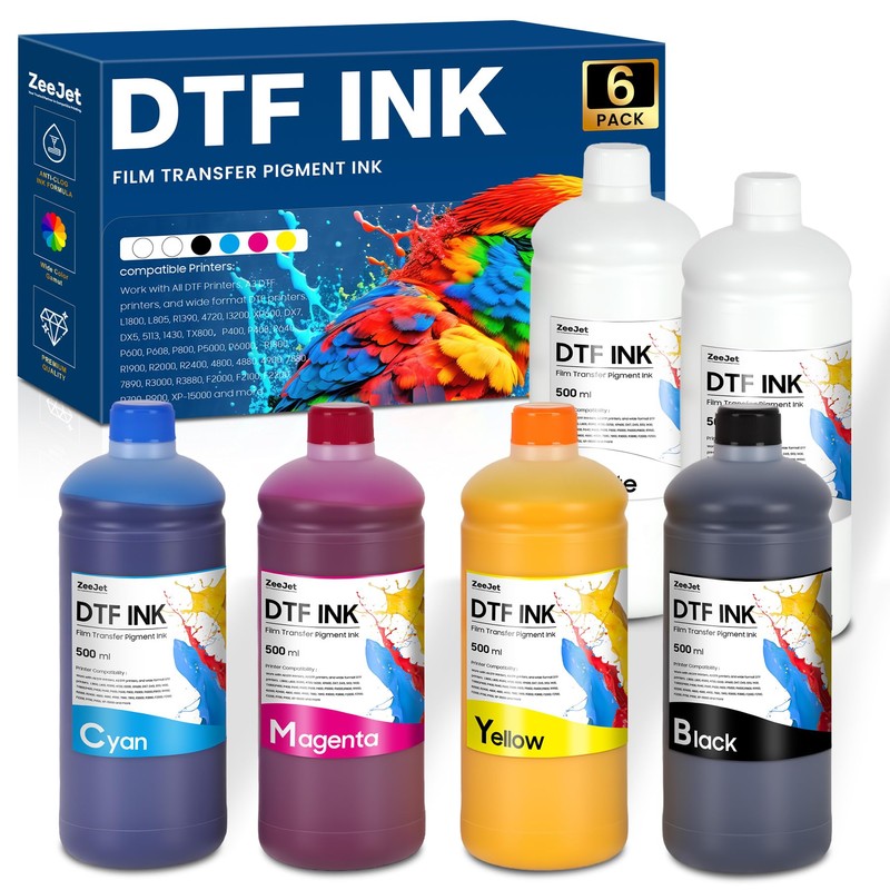 Zeejet Premium DTF Ink 500ML 6-Pack Set DTF Transfer Ink for PET Film, for All DTF Printers L1800 R1390 ET-4800 8550 XP15000 I3200 4720 XP600 TX800 ET2800 (2*White + 1*Black Cyan Magenta Yellow)