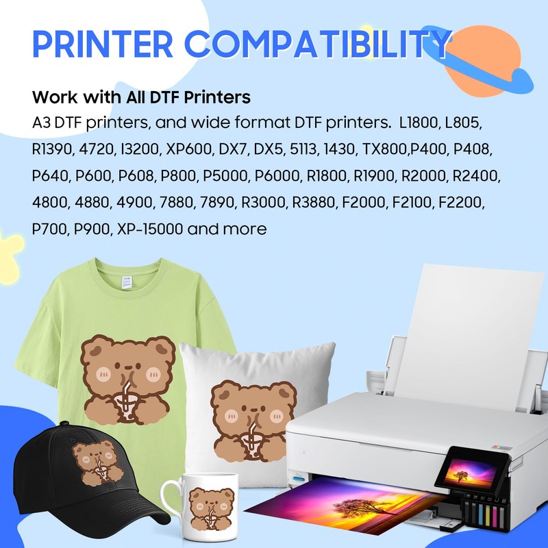 - Work with All DTF Printers, A3 DTF printers, and wide format DTF printers Compatible printheads: L1800 L805 R1390 4720 I3200 XP600 DX7 DX5 5113 1430 TX800 P400 P408 P640 P600 P608 P800 P5000 P6000 R1800 R1900 R2000 R2400 4800 4880 8500 8550 4900 7880 7890 R3000 R3880 F2000 F2100 F2200 P700 P900 XP-15000 L801 L800 L850 T50 T60 R290 RX610 690 R200 R210 R220 R300 R310 R340 R350 and more