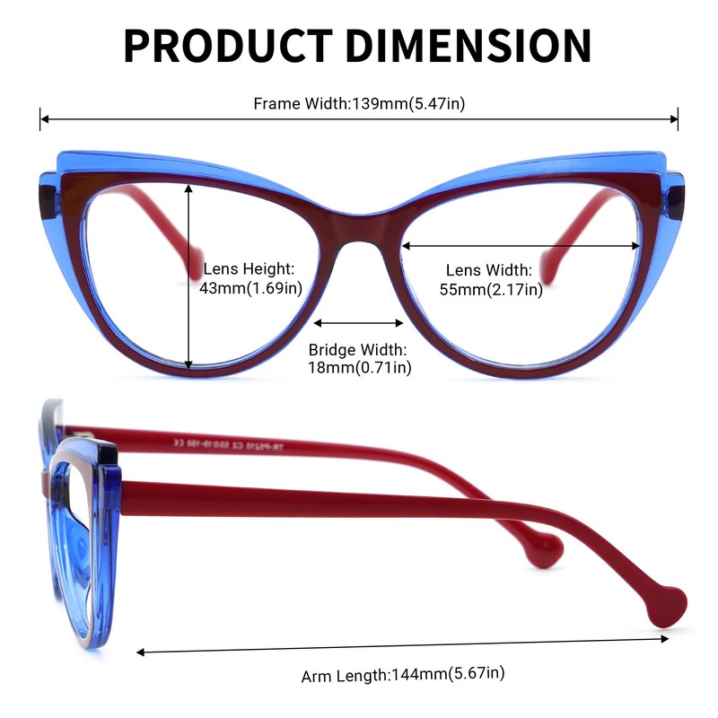 - [Dimension]Lens width:55mm (2.17") | Lens height:43mm (1.69") | Bridge width:18mm (0.71") | Frame width:139mm (5.47") | Arm length:144mm (5.67")