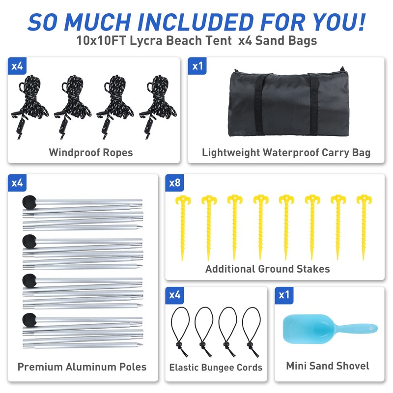 - Advanced Sun Protection - Our sun tents for beach and outdoor crafted with high quality elastic Lycra fabric, offering UPF 50+ sun coverage protection. Can block up to 98% of harmful UV rays, reduce sunburn or glare with protection coating making it ideal for kids or adults laying out. Superb shade windproof, water resistance beach sun cover keep you protected on both sunny and rainy days. Combined with excellent 4-sided ventilation performance enjoy the sea breeze in the shade of the beach