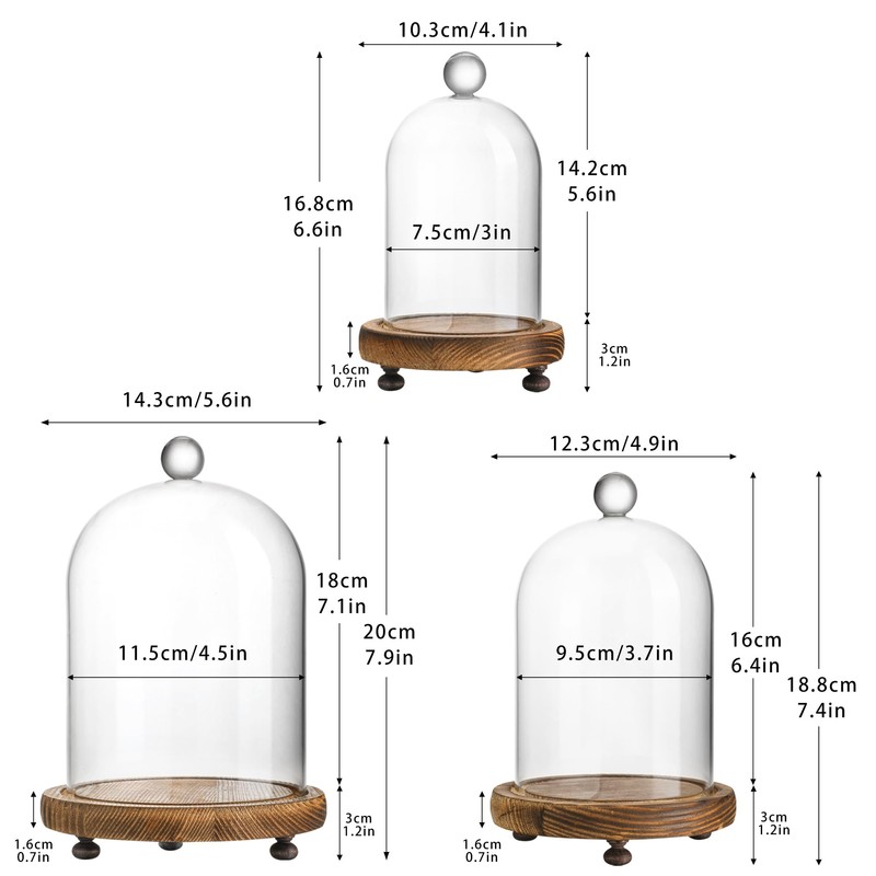 - Cloche Glass Dome: Totally 3 pcs of glass domes,with 3 wooden bases,in three different sizes. One is 4.1W*6.6H, the second one is 4.9W*7.4H,the third one is 5.6W*7.9H.