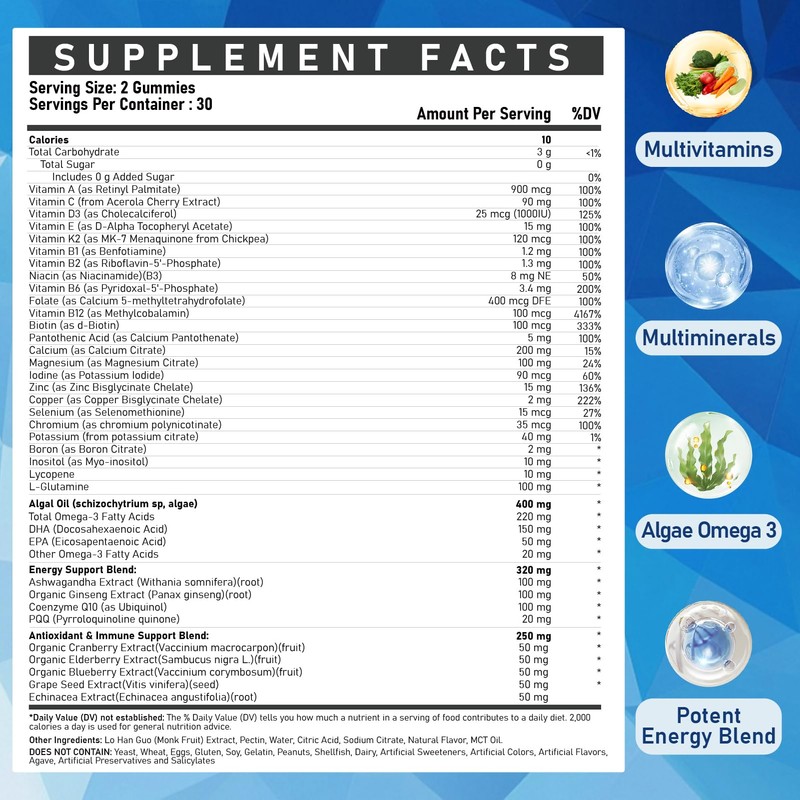 • ENERGY & F0CUS SUPPORT: Vitamin B Complex, L-Glutamine, and the Energy Support Blend (containing Ashwagandha, Ginseng, CoQ10, and PQQ) work synergistically to support mitochondrial health and provide the sustained energy. Algae Omega-3 (with DHA) combined with PQQ promotes clarity and focus, while Vitamin A supports healthy vision. The mens daily multivitamins support your busy lifestyle requires and help you go harder and further.