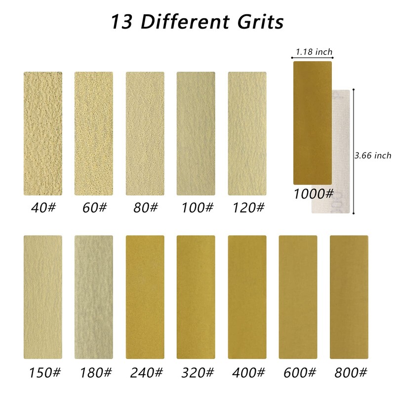 - WHAT YOU GET: 10 sheets of each 40/60/80/100/120/ 150/180/240/320/400/600/800/1000 grit, 130 sheets sander paper in total+1 Pcs detail hand sanding block, Variety of grits can meet most of your daily usage