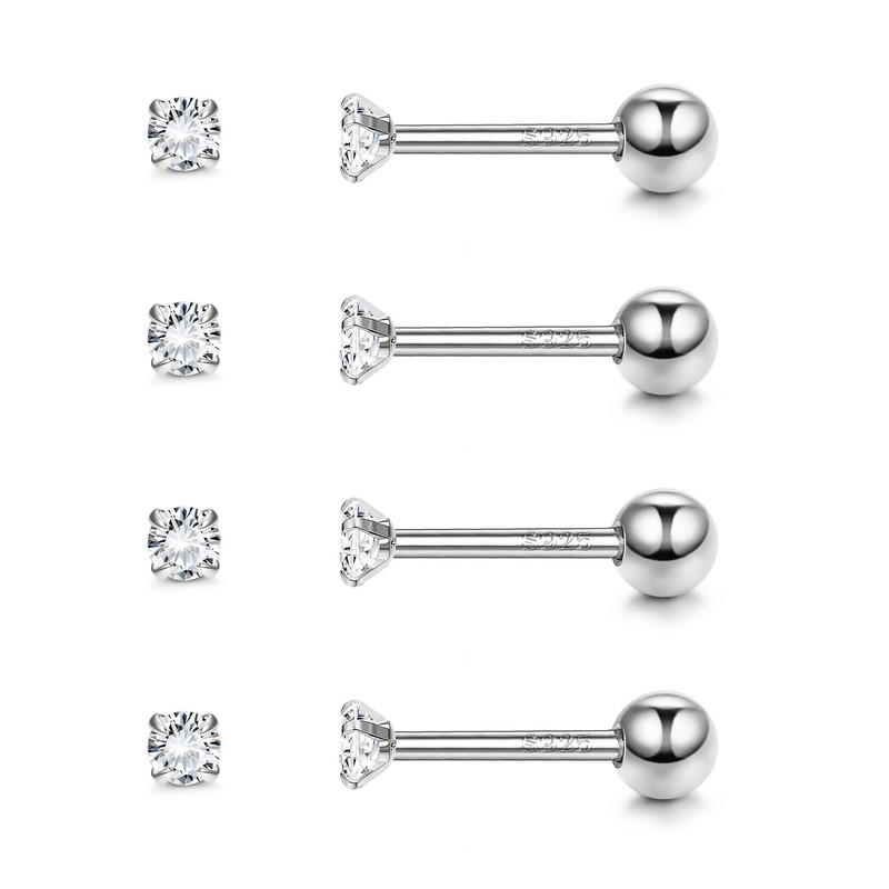 ZELORES 4 Pairs 18G Sterling Silver Cartilage Earrings Stud Screw Back CZ Tragus Helix Earrings Set Tiny CZ Stud Earrings for Women Men 2mm (Silver-Ball Back)