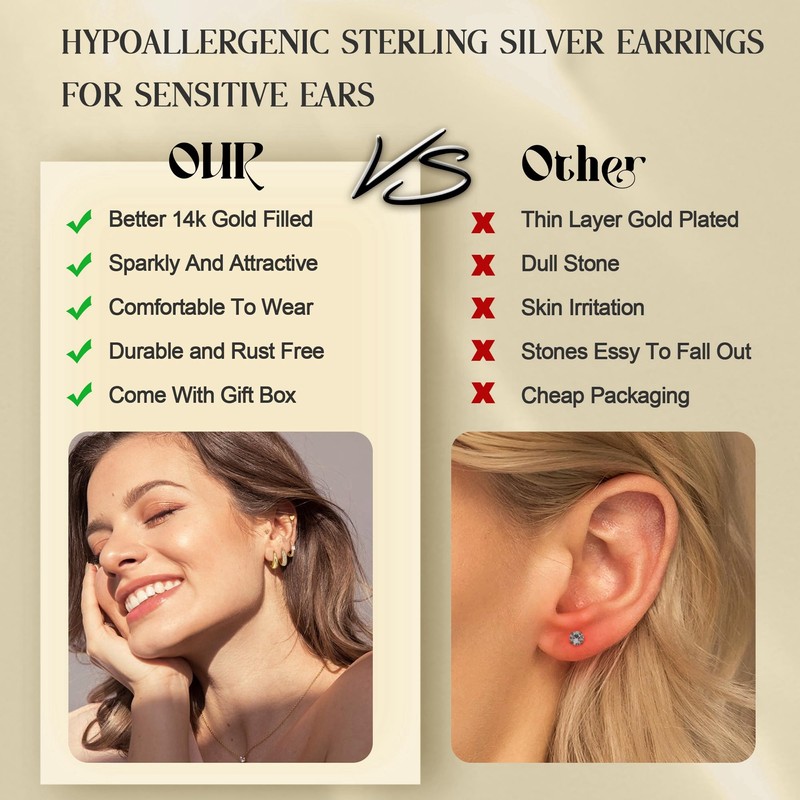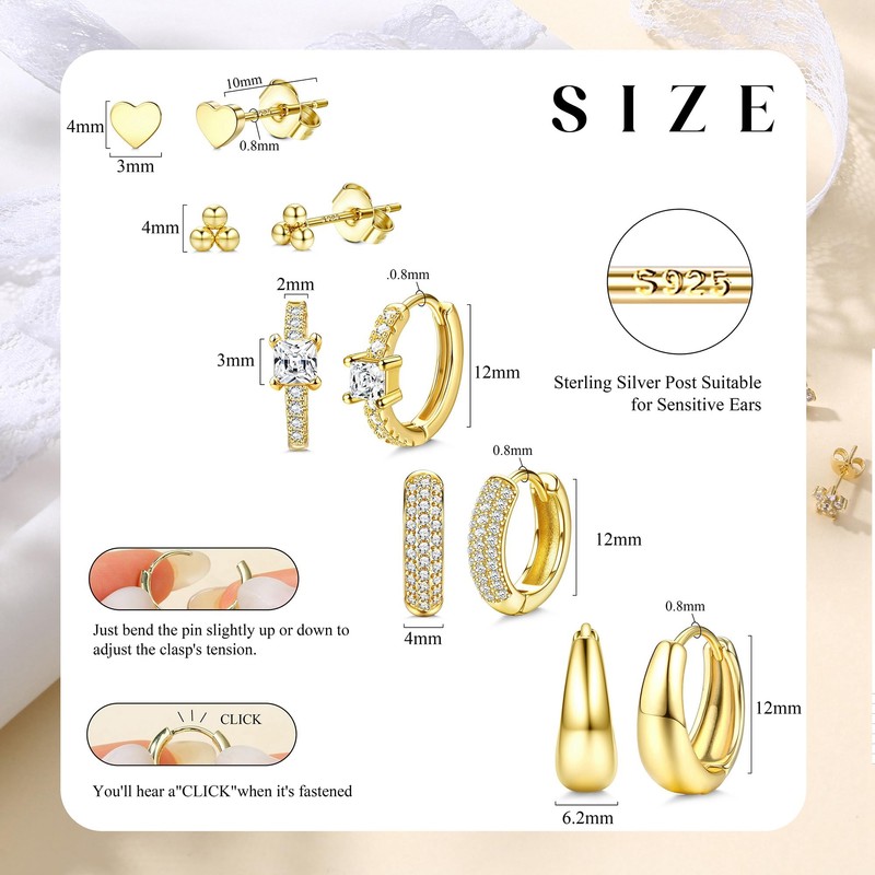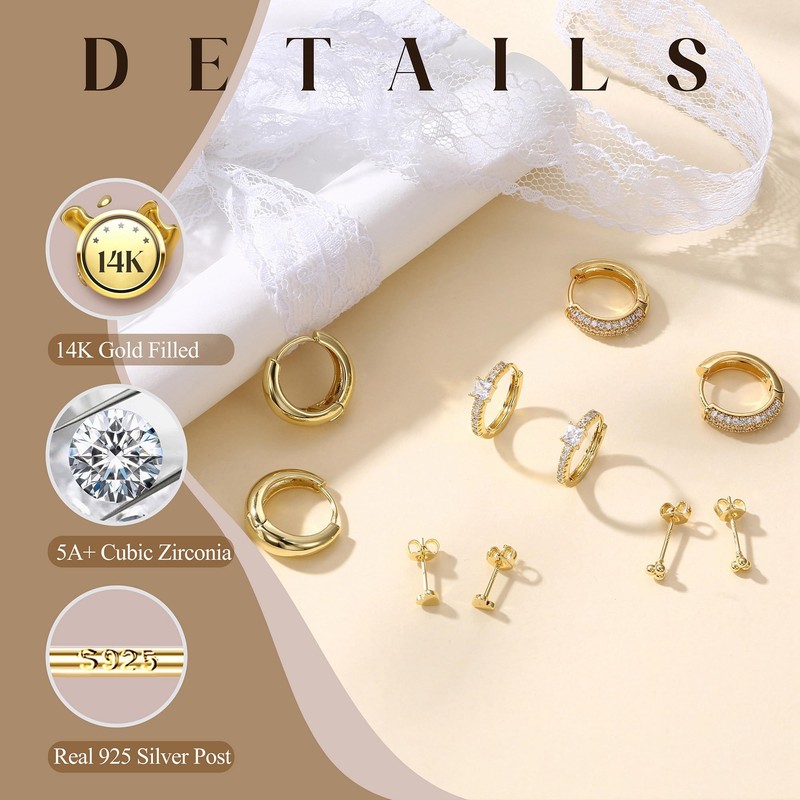 - Hypoallergenic Sensitive Ears: Experience luxury with our sterling silver post earrings, lavishly plated in white gold or 14K gold filled. These gold huggie earrings set ensure safety, comfort, and a perfect fit for everyday wear. Made from premium materials, these small gold stud and hoop earring stacks maintaining their long lasting beauty and wearability