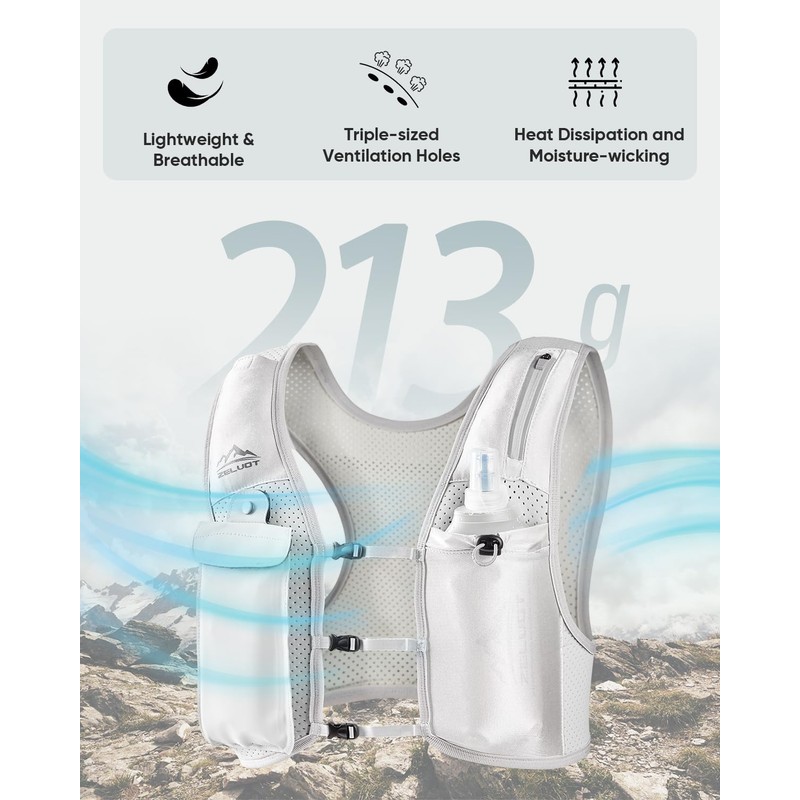- Breathable and Featherlight - Zelvot hydration vest is made from breathable, lightweight neoprene with triple-sized ventilation holes for accelerated air circulation and moisture-wicking. It barely tips the scales at 7.5 ounces, ensuring it won't slow you down. Reflective logo and strip on the front and back increase safety in low-visibility scenarios. This reflective running vest makes every run farther, safer, and more comfortable.