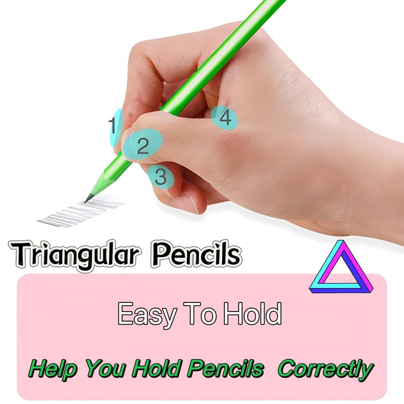 - [Triangular Shaped Pencils, Easy to Hold! Comfortable! Help You Hold a Pencil Correctly!] These triangle pencils were easy to hold and grip. Help you hold a pencil correctly! They are made out of eco-friendly resin, and not wood, So newly recycled PrettyPencils #2. Save a tree, right? These Cute Pencils with erasers come in a pack of 12 count and include a little plastic manual sharpener. Each triangle Pencils sports an eraser on top. Recommend them to anyone with kids learning how to hold a pencil OR adults who just was a comfortable pencils!