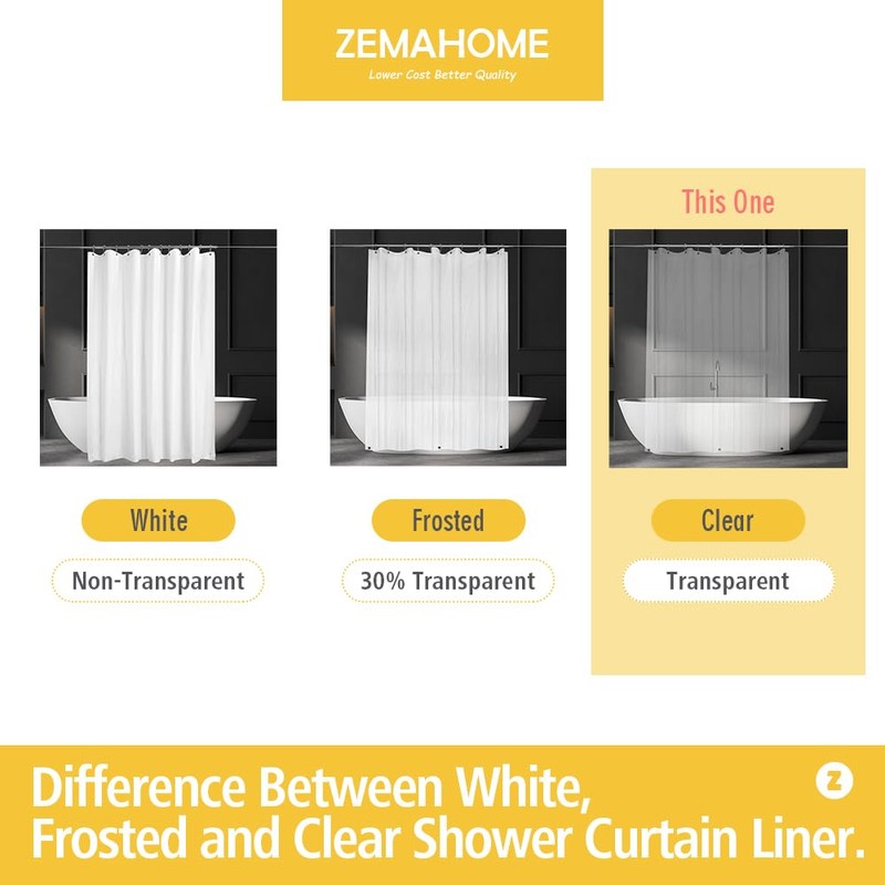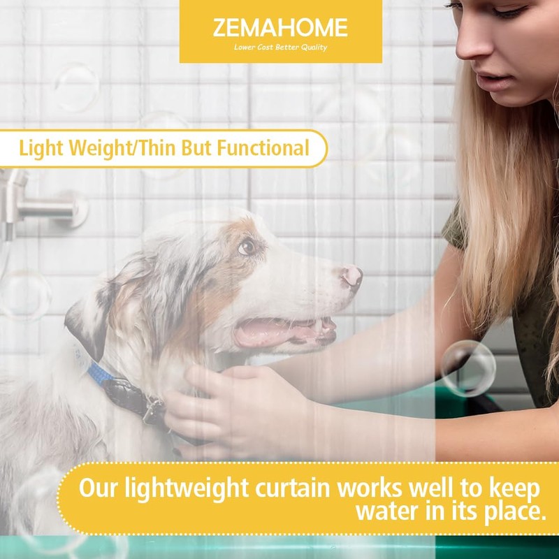 - [GOOD QUALITY] - Made From 3.2 Gauge Hight Quality EVA Material. This Shower Curtain Liner is Thin(Light Weight) but Strong with no plastic smells. Each Curtain Has passed our Weight Test in ZEMAHOME Lab, which can hold up at least 5 Gallon watter Bottle. This Premium Light-Weight shower curtain liner will create a better Bathroom for you and your family. Get A Pair of Our ZEMAHOME Shower Curtain Liner to find out!