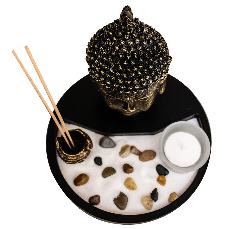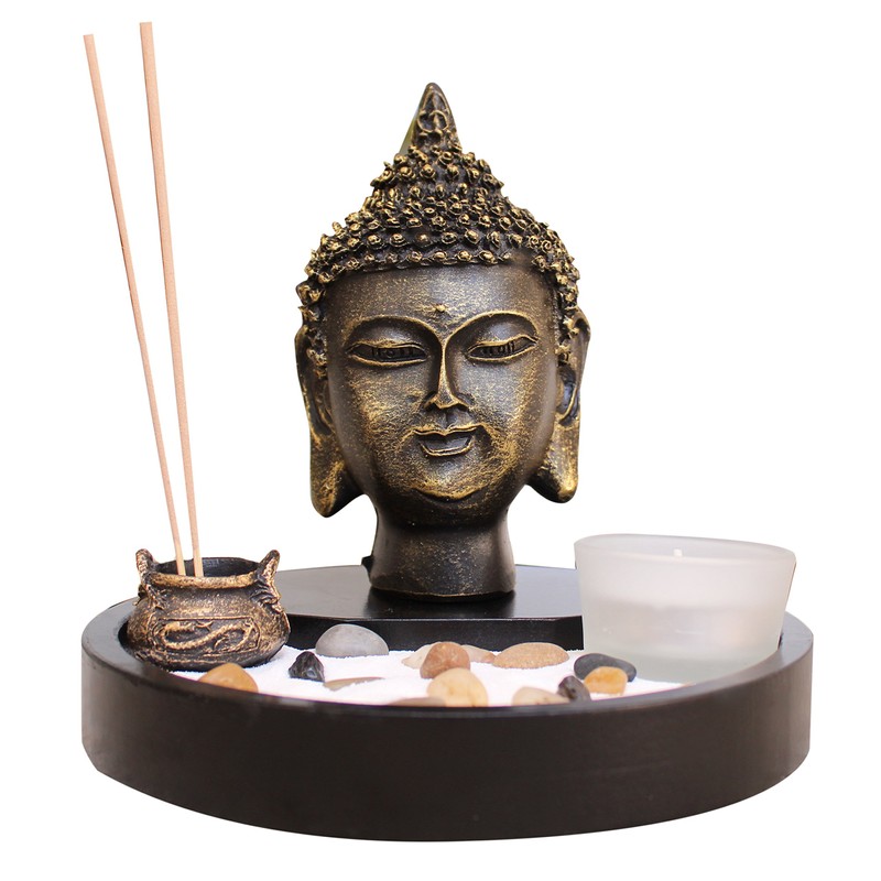 Zen Garden Deluxe Desk Meditation Garden Includes Large Buddha Head Statue, Incense and Incense Holder, Sand, Rocks, Tea Light Holder (Candles Not Included)