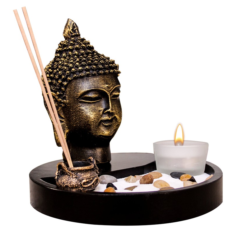 - Includes candle holder (Candle NOT included) , Buddha head ornament, incense and incense holder, decorative rocks and wooden display tray.