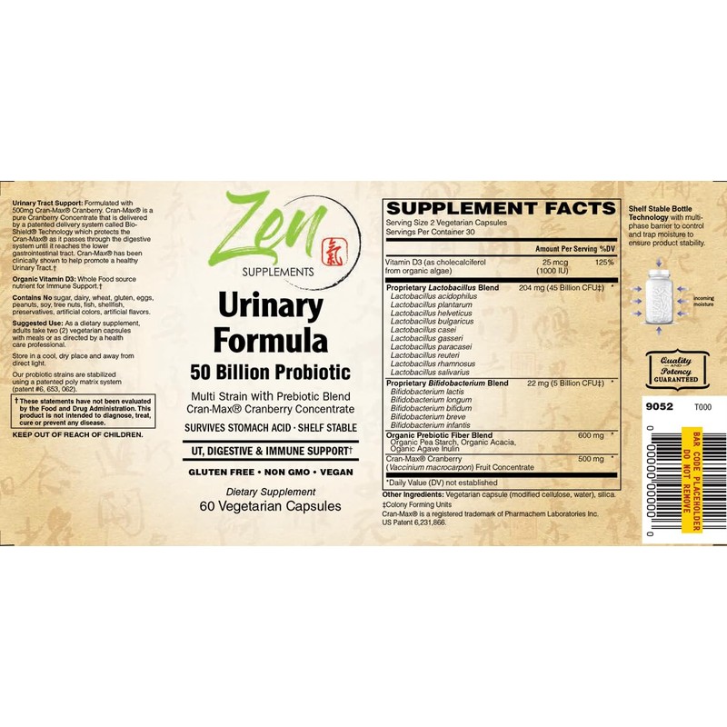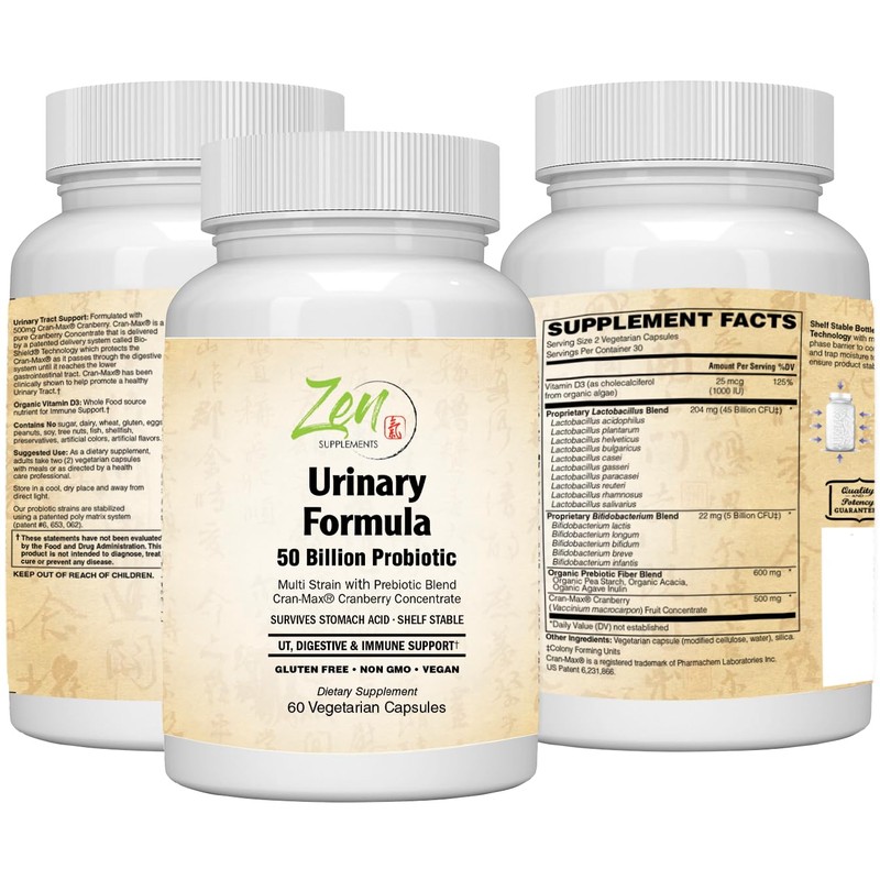 • Urinary Health: Zen Urinary Formula contains 50 billion CFU probiotics and Cran-Max Cranberry to support urinary tract and immune system health.