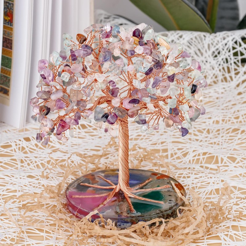 - 🌳About the Crystal Tree: The crystal tree is also known as the feng shui tree. The feng shui Money tree brings good luck, and prosperity, and provides protection. Handmade gemstone copper wire wrapped tree: natural tumbled gemstone leaves, copper wire trunk, round agate slice base, an exquisite tree life decoration for home office decoration. bedroom, zen room, dining room, living room.