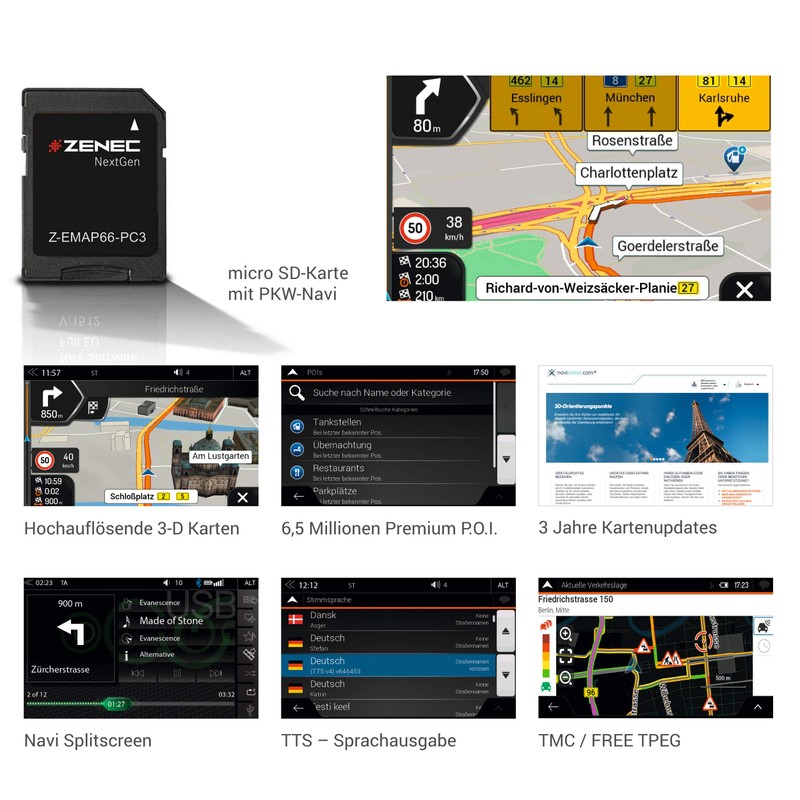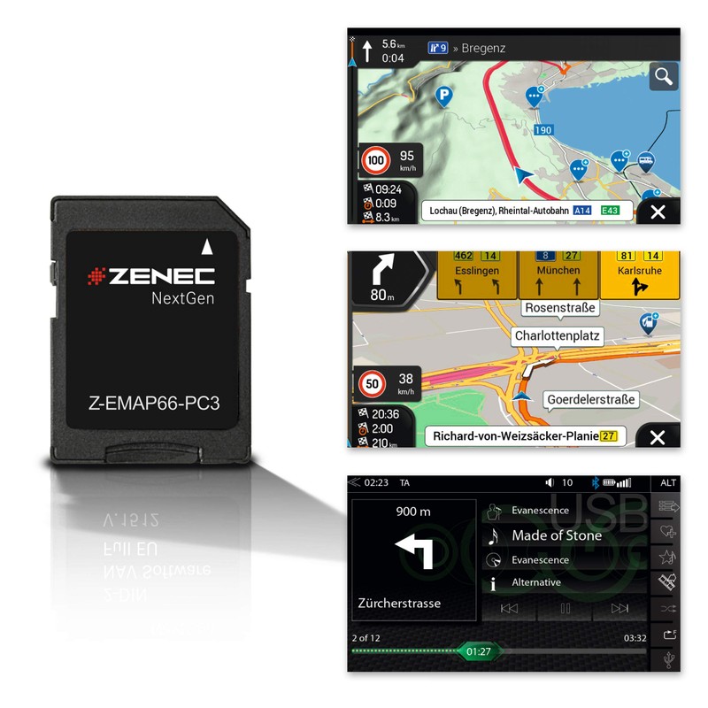 - Navigation software Z-EMAP66-PC3 for the ZENEC 2-DIN car radios Z-N966 and Z-N965: The micro SD card in the SD adapter is simply inserted into the SD card slot of the media center, and the multimedia system becomes a fixed installation navigation system with comprehensive navigation functions.