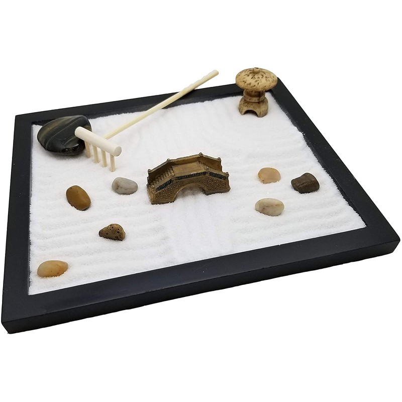 - ✔COMPLETE ZEN DECORATION KIT: Our mini Japanese zen sand garden kit includes all the accessories for a peacefully moment of meditation: solid wood tray 8.5 x 6.7 x 0.5 inches, white sand, bamboo rake, rocks, 2 figures. Ideal for desks, tables, countertops & more