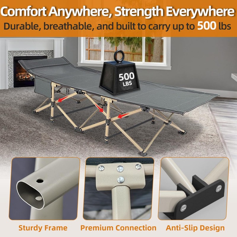 - 【VERSATILE USAGE】 Whether you’re lounging in your backyard on a sunny day, setting up a quick rest area at the office, or preparing for an outdoor festival, this camping cot for adults isn’t just for camping—it’s a multi-purpose tool for relaxing, working, or entertaining. Adapting to your needs, it makes every moment more comfortable