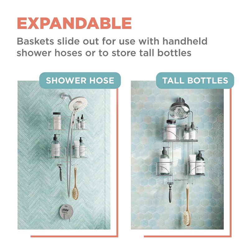 - MADE TO USE WITH TODAY'S SHOWER HOSES: Expanding basket feature enables handheld shower hoses to be used with caddy