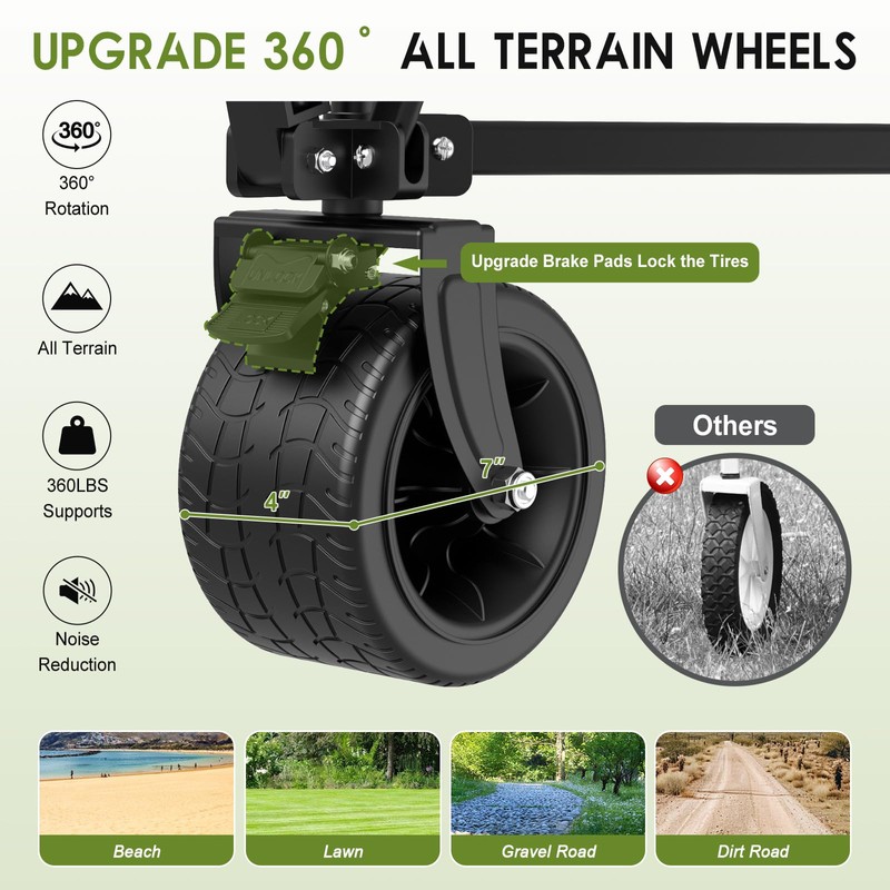 - 【Big All-Terrain Beach Wheels】Lounge wagon features four 7*4in PVC all-terrain wheels(Usually other products are only 5*2.5in) built to handle hard sand, grass, and all kinds of complex ground. It features strong abrasion resistance, silent shock absorbance, wear proof, no drag marks and enhances the impact resistance of the wheels.Front swivel wheels with brakes provide extra control, ensuring your grocery cart stays put on slopes or uneven ground.