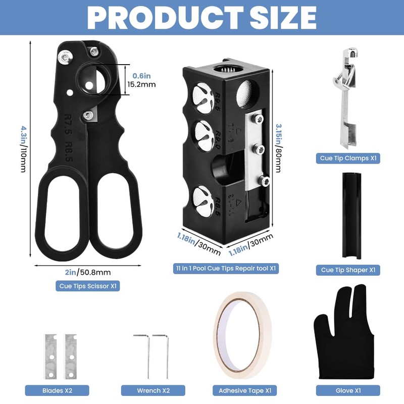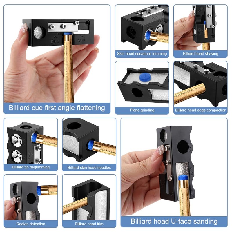 - [Complete Cue Tip Replacement Kit] Includes 1 multi-functional cue tip trimmer, 1 glove, 1 manual, 1 scissors, 1 masking tape, 1 holder, 1 sander, 2 blades, and 2 hex keys. Designed for precise cue tip replacement, trimming, scuffing, and polishing, ideal for professional-level maintenance.