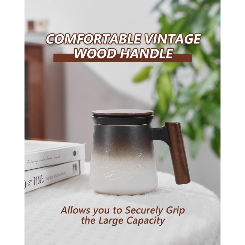 - COMFORTABLE WOOD HANDLE AND LID: The artistic bits of this tea mug would have to be the specially wood handle, the ergonomically-designed angle and Thumb holder that allows you to comfortably and securely grip. The wooden lid keeps the tea warmer and the aroma long-lasting. it's also doubles as a coaster to catch drip tea after finished steeping. the wooden features create a cosy aesthetic and adds a vintage touch to your coffee and end table.