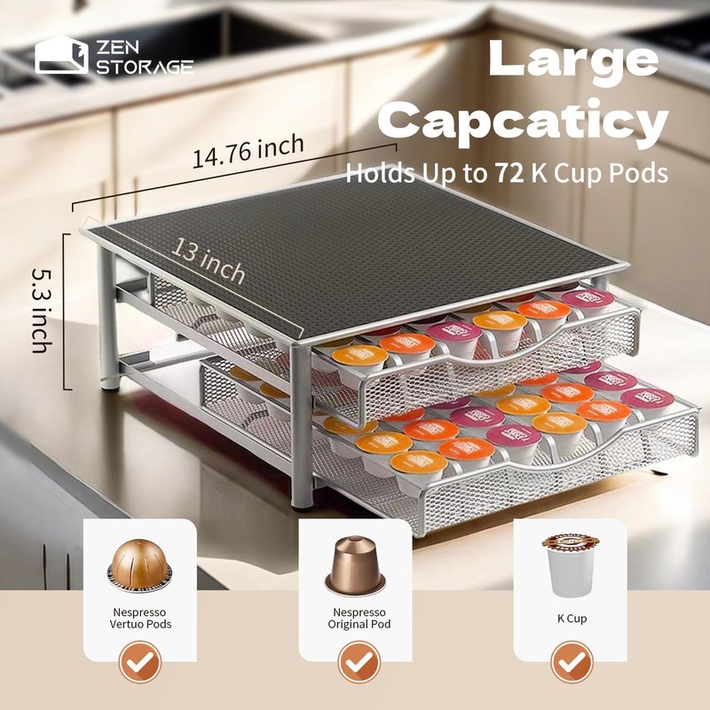 - [Large Capacity] - The coffee pod organizer is compatible with K-Cups and will hold up to 72 of your favorite pods.