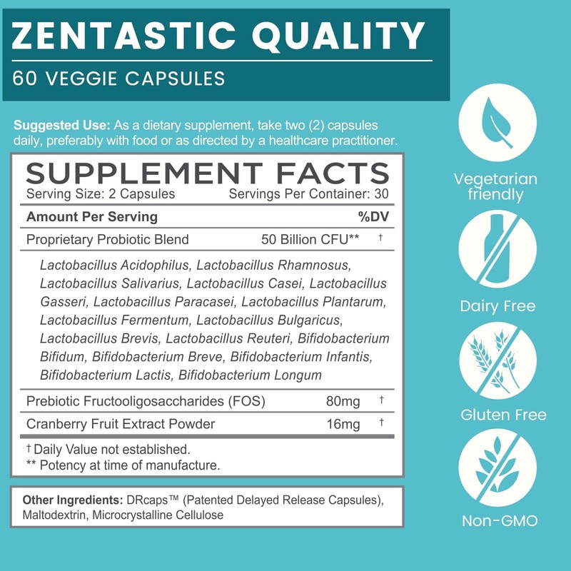 - BALANCED, EFFECTIVE FORMULA: Zentastic Probiotic is powered by 50 billion live cultures and features 16 beneficial strains, including Lactobacillus Acidophilus, to provide broad support for men's and women's overall health. Each veggie capsule also contains prebiotic fuel to empower these good organisms to flourish within the microbiome.*
