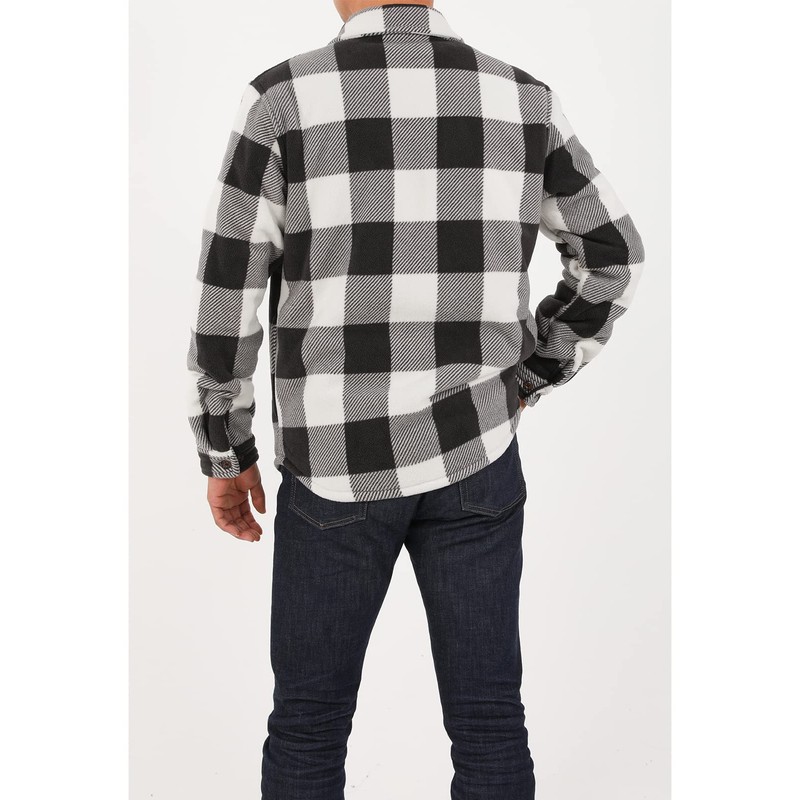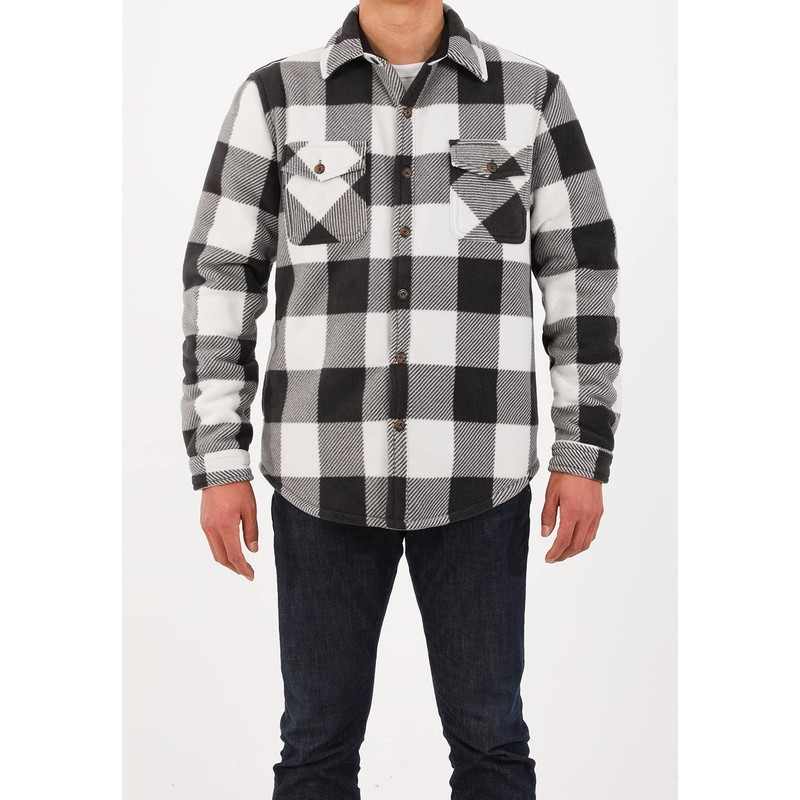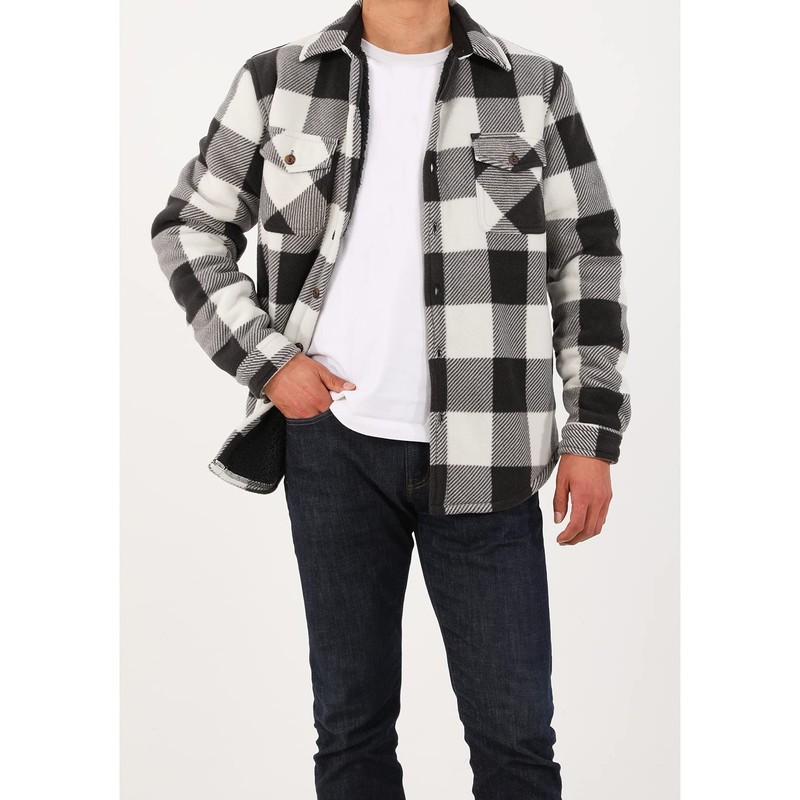 Men's sherpa fleece shirt with button closure, two chest pockets, 2 side pockets to keep your hands warm, a versatile option that can be worn over a shirt or as an alternative to outerwear. Stay warm outside with this buffalo plaid jacket with sherpa lining.