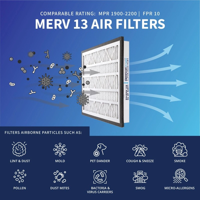 • Merv 13 High Efficiency Filter removes Virus carriers, flu, smoke, allergens, dust and mold from your breathing air for 6 months