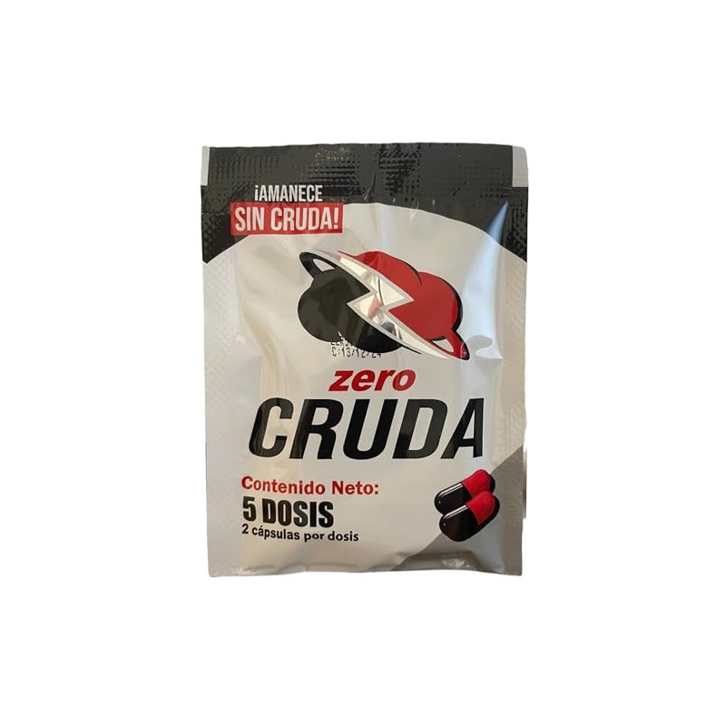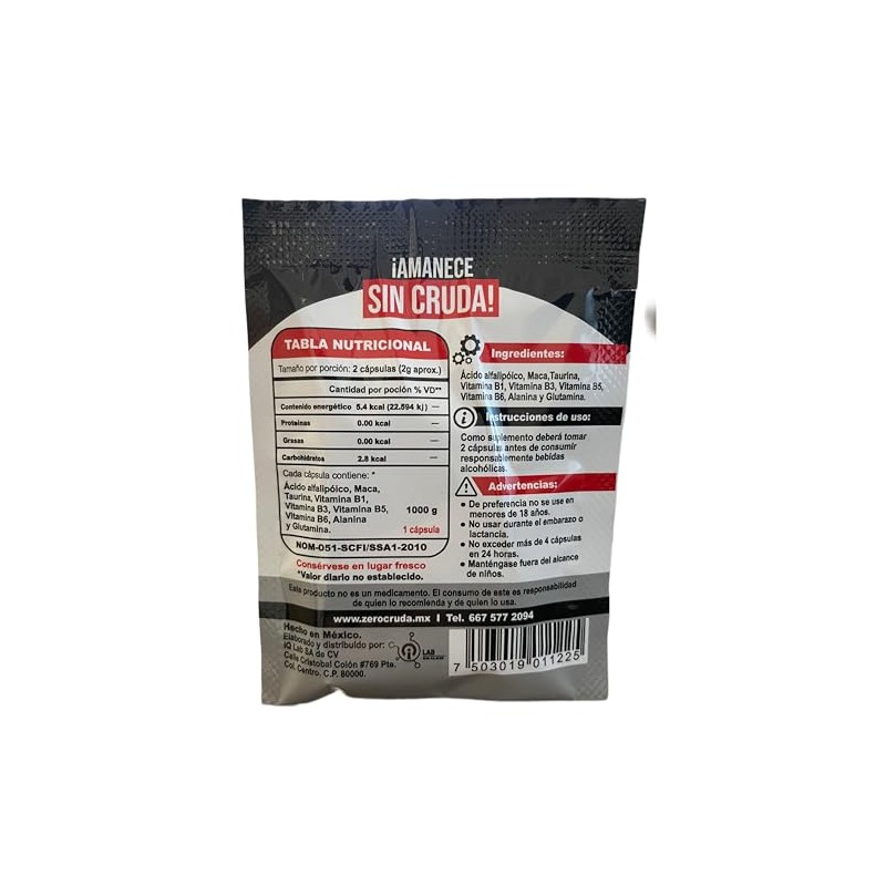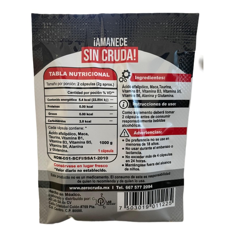 Zero Cruda está compuesto por 2 potentes capsulas con complejos de Vitamina B, Aminoácidos, Maca y Acido Alfa Lipoíco. Zero Cruda ayuda al correcto funcionamiento del sistema hepático. El complejo de vitaminas que se encuentra en nuestra fórmula ayuda a mitigar los molestos efectos de la resaca, cabe destacar que está comprobando científicamente que la concentración de ácido alfa lipoíco de zero cruda ayuda a eliminar los metabolismos causantes de la resaca como también: Actúa disminuyendo los niveles de acetaldehído (agente tóxico) combinándose en vivo.